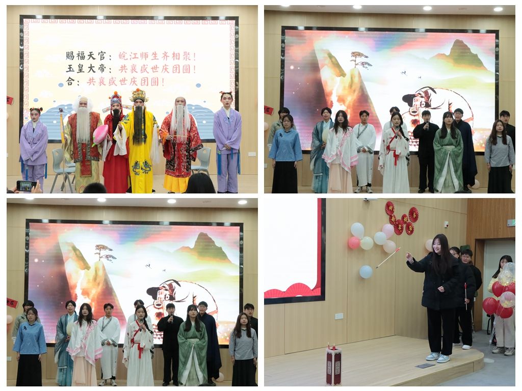 伴随着优美婉转的戏曲声,联欢会正式拉开序幕。心栖梦归处,歌曲《一路生花》唱响了青春的风采。百年光影流变,青年热血不减,配音表演《觉醒年代》用铿锵有力的声音带领观众们回忆先辈们的征途。笛声渐响,琴声悠扬,《兰亭序》熟悉的旋律引发在场所有人情感的共鸣。月是故乡明,国是中国强,诗歌朗诵《月光下的中国》诉说着对祖国的祝愿,愿山河无恙,春光永驻华夏。武术表演动作行云流水,气势直吞山河,令观众们赞叹不已。低吟浅唱,是对往昔岁月的眷恋;放声高歌,是对崭新未来的展望,歌曲串烧《青春旅行》全面带动了现场的气氛,获得阵阵掌声。五千年文化,三千年诗韵,朗诵表演《诗韵流觞话今朝》传唱着千年来的经典,展现了中华文化的永久魅力。最后,联欢会在一曲大合唱《稻香》中圆满落下了帷幕。